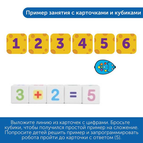 Используя двусторонние карточки, игральные кубики и математические коврики, дети познакомятся с основными принципами кодирования, сложением, вычитанием, последовательностью чисел.
