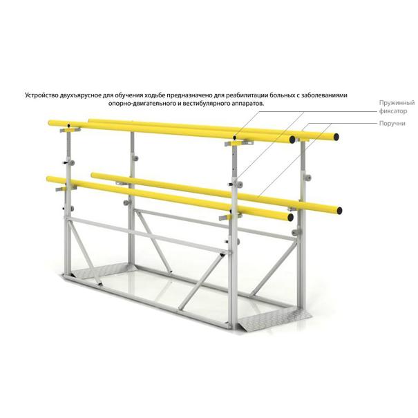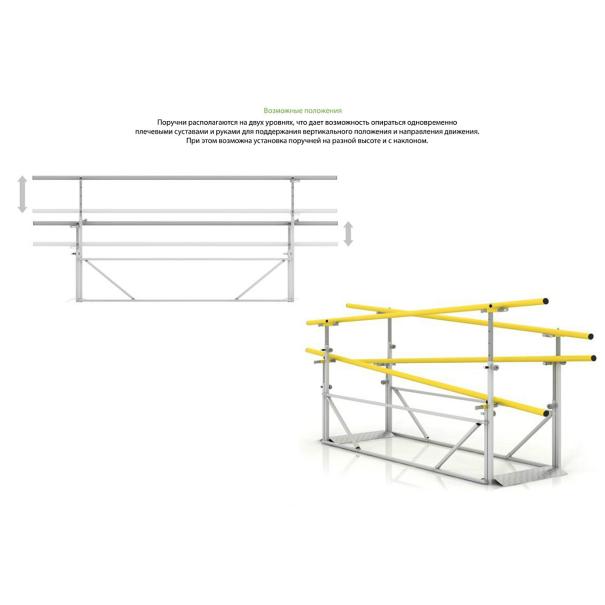 Поручни располагаются на двух уровнях, что дает возможность опираться одновременно плечевыми суставами и руками для поддержания вертикального положения и направления движения. При этом возможна установка поручней на разной высоте и с наклоном