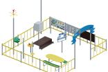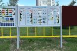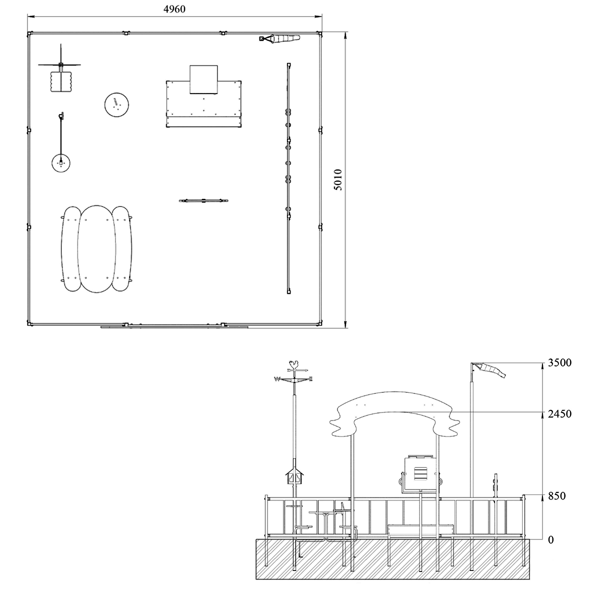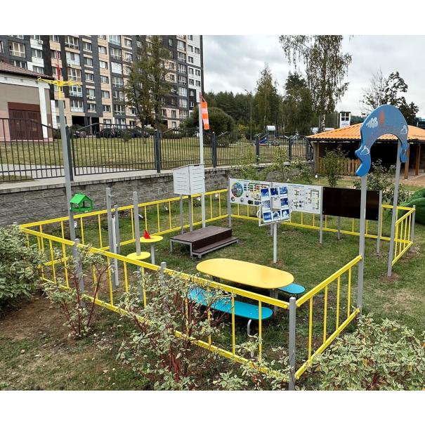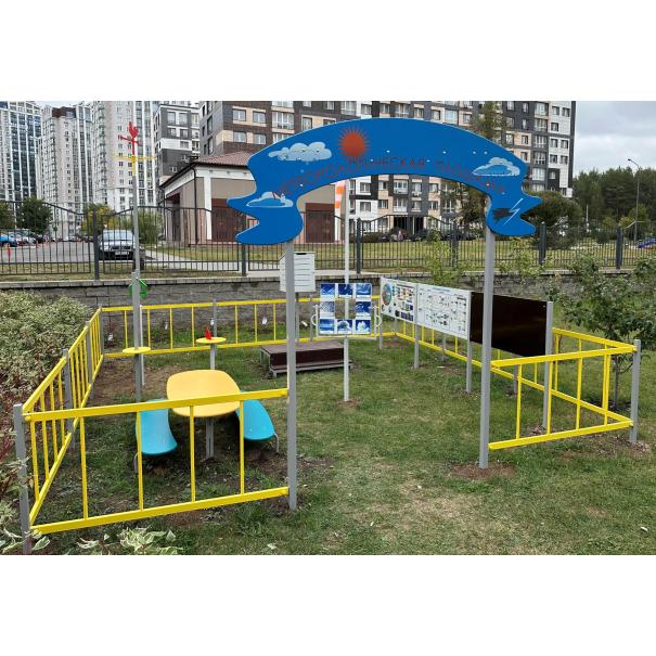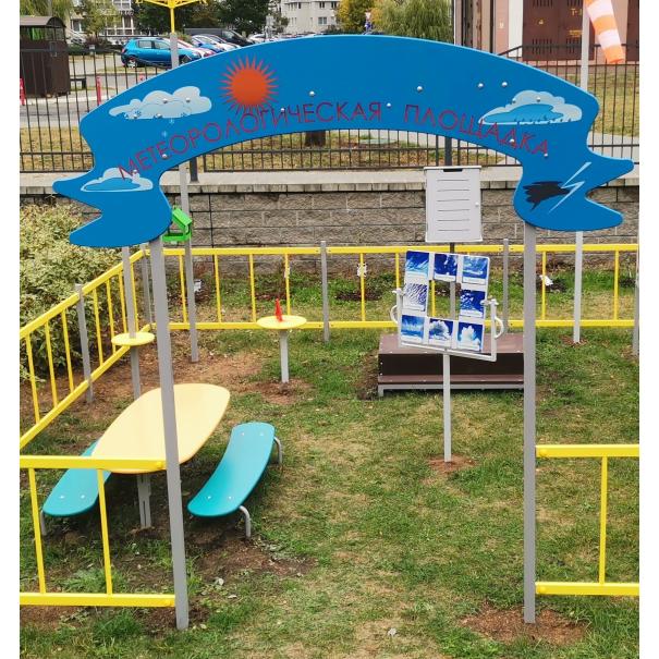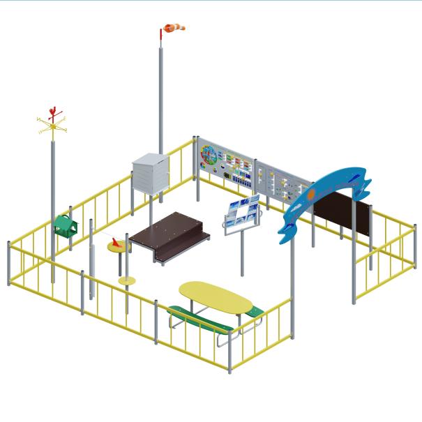 Метеоплощадка должна состоять из входной арки, ограждений по периметру и игровых образовательных элементов. В центре площадки расположены: столик со скамьями, солнечные часы, линейка для измерения снежного покрова, мерзлометр, гололедный станок, флюгер в виде петушка, кормушка для птиц, панель "Времена года", панель "Календарь погоды", панель "Доска для рисования", стойки игровых панелей, ветровой рукав, метебудка с термометром и барометром, подиум для метебудки, стенд "Ловец облаков", может находиться осадкомер. Периметр площадки состоит из металлического ограждения в виде заборчика и входной арки и стоек для ограждений.