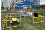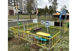 Ограждение по периметру площадки должно быть выполнено из металлических продольных элементов сечением не менее 50х25мм и вертикального заполнения из труб диаметром не менее 21 мм. Стойки для ограждений из металлической профильной трубы сечением не менее 40х40 мм. С приваренными фланцами для крепления пролетов огражения. Размер пролетов 1600х25х750 мм. Количество пролетов 11 штук. Размер угловых стоек ограждения 90х90х860 мм, количество угловых стоек ограждения 4 штуки. Размер промежуточных стоек ограждения 90х90х860 мм, количество промежуточных стоек ограждения 6 штук. Пролеты надежно крепятся к стойкам с помощью болтов, закрытых пластиковыми заглушками. Стойки ограждения бетонируются в земле.