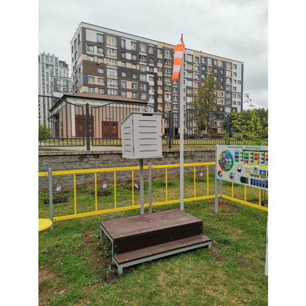 Метеобудка размером 450х467х1815, состоит из шкафчика, выполненного из влагостойкой фанеры толщиной не менее 9 мм, несущего каркаса шкафчика, из бруса сечением не менее 30х50мм. Дверца крепится на две петли. Внутри шкафчика установлены термогигрометр и барометр (либо термометр, барометр и гигрометр, либо прибор 3 в 1). Шкафчик устанавливается на опорную стойку, из металлической профильной трубы сечением не менее 40х40мм и высотой не менее 1700 мм, с приваренным к ней фланцем для крепления к подиуму. Фланец выполнен из металлической пластины толщиной не мене 4мм. К стойке приварена металлическая пластина круглой формы диаметром не менее 150мм и толщиной не менее 4мм, предназначенная т для крепления стойки к шкафчику.