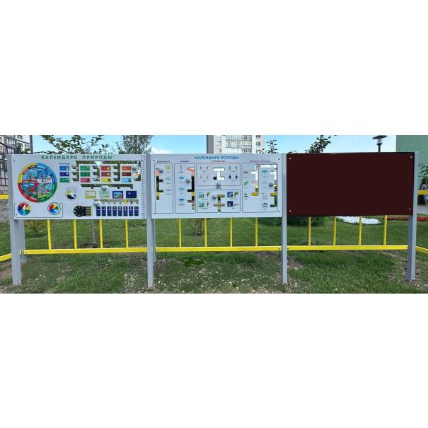 Игровая панель "Календарь погоды", размером 1240х21х610 мм., должна быть выполнена из влагостойкой фанеры толщиной не менее 21 мм с нанесенными схематическими изображениями, к которым ведут дорожки - прорези с перемещающимися по ним бегунками. Схематические изображения позволяют отмечать: облачность (3 состояния), осадки (4 вида), температуру (4 состояния), силу ветра (4 состояния), явления природы (7 видов). Панель устанавливается на стойки размером 90х40х1200 мм, выполненные из металлической профильной трубы сечением не менее 40х40 мм. К стойкам приварены фланцы для крепления панели, выполненные из металлической пластины толщиной не менее 3мм. При монтаже стойки бетонируются в земле. Места резьбовых соединений закрыты пластиковыми заглушками. Верхние основания стоек закрыты пластиковыми крышками.
