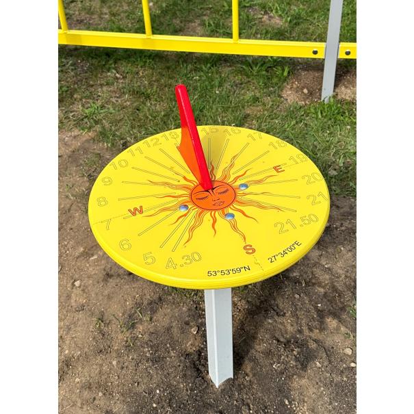 Солнечные часы размером 400х400х650 представляют собой циферблат, выполненный из окрашенной влагостойкой фанеры толщиной не менее 21 мм с гномоном, выполненным из влагостойкой фанеры толщиной не менее 15 мм. Циферблат расположен на стойке выполненной из металлической профильной трубы сечением не менее 40х40мм с приваренными фланцами выполненными из металлической пластины толщиной не мене 3мм, которые крепятся к циферблату и металлической пластине круглой формы диаметром не менее 150мм и толщиной не менее 4мм которая служит для фиксации изделия. Стойка часов бетонируется в земле.