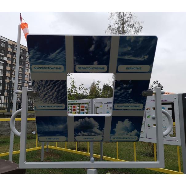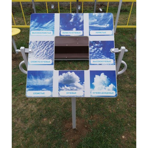 "Ловец облаков" размером 824х50х1365, должен состоять из фанерного стенда с прорезью в виде квадратного окна, металлической рамы и металлической стойки. Стенд должен быть выполнен из водостойкой фанеры толщиной не менее 21 мм., с изображением 7 видов облаков. Стойка высотой не менее 1200 мм должна быть выполнена из металлической трубы 50х50 мм. Металическая рама должна быть выполнена из трубы 40х40 мм и оснащена ручками для вращенияя. Угол вращения в горизонтальной плоскости 180 градусов, в вертикальной 90 градусов. Места резьбовых соединений закрыты пластиковыми заглушками. Верхние основания стоек закрыты пластиковыми крышками. Стойка бетонируется в земле.