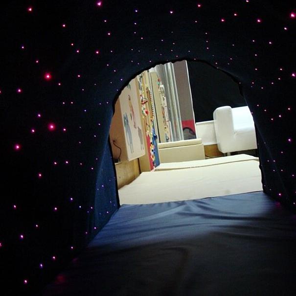 Этот уникальный мягкий тоннель непременно понравится всем детям, ведь играть с ним интересно как в светлом помещении, так и в затемненном, рассматривая причудливое мерцание звезд фиброоптических волокон.