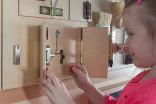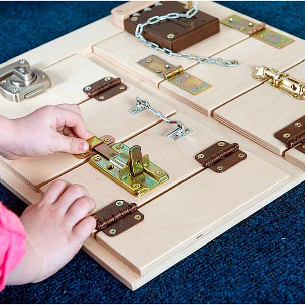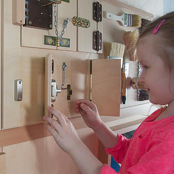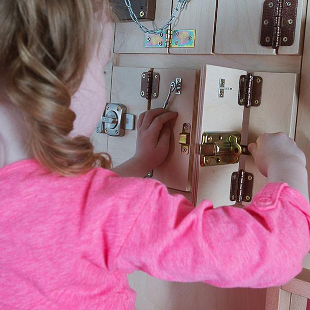 Тактильно-развивающая панель состоит из нескольких дверок с различными видами замков и щеколд. Панель предназначена для развития мелкой моторики, развития осязательных навыков, освоения алгоритмов открывания и закрывания. Панель выполнена из высокопрочного дерева и имеет специальное настенное крепление.
