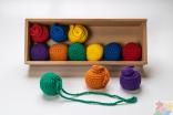 Первый: шерстяные (текстильные) мячики на нитках. Знакомит малыша с разными цветами и такими простыми движениями, как: влево-вправо, вниз-вверх, уже-шире, выше-ниже и др. Ребенок получает представление о пространственной ориентации.