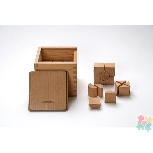Третий: восемь маленьких кубиков, объединенных в один большой «куб из кубиков». Отличное подспорье в усвоении таких понятий, как «часть», «половина», «целый предмет», «одна четверть» и др.