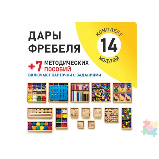Первые шесть комплектов представляют базовые «дары» немецкого педагога, их использование помогает ребенку усвоить и почувствовать самые важные цвета и формы окружающего мира, а также познакомиться с основными абстрактными понятиями.