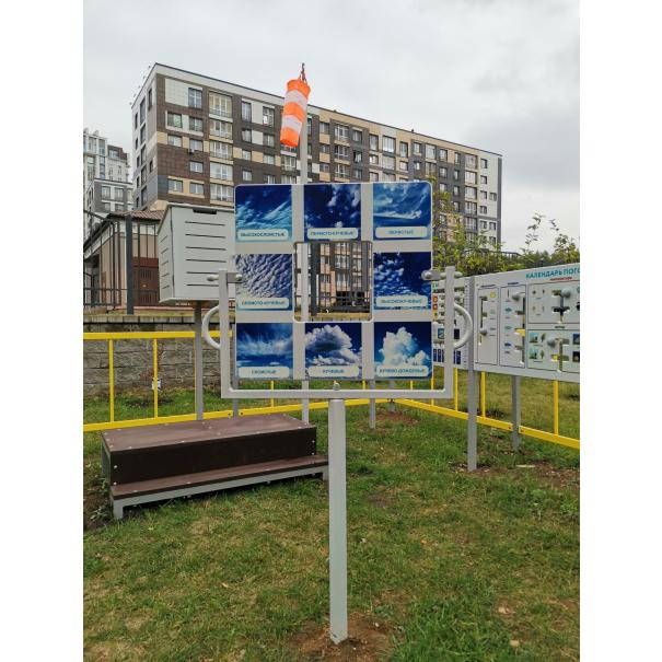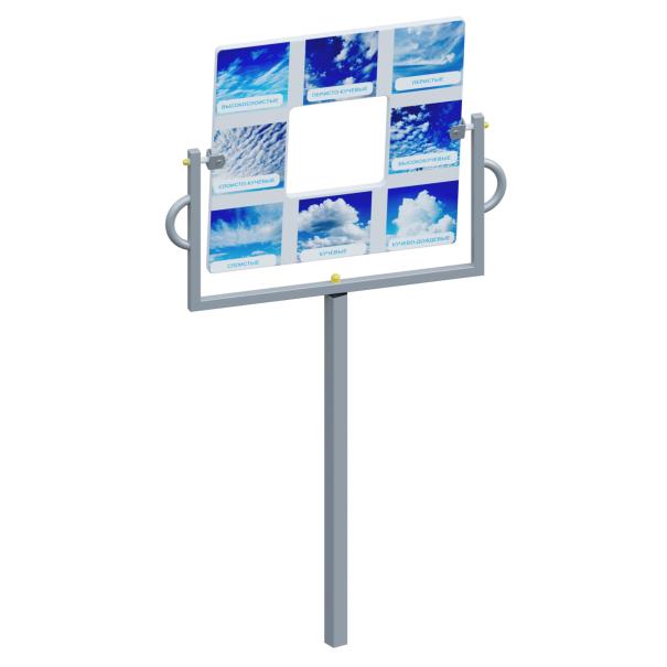 "Ловец облаков" размером 824х50х1365, должен состоять из фанерного стенда с прорезью в виде квадратного окна, металлической рамы и металлической стойки. Стенд должен быть выполнен из водостойкой фанеры толщиной не менее 21 мм., с изображением 7 видов облаков. Стойка высотой не менее 1200 мм должна быть выполнена из металлической трубы 50х50 мм. Металическая рама должна быть выполнена из трубы 40х40 мм и оснащена ручками для вращенияя. Угол вращения в горизонтальной плоскости 180 градусов, в вертикальной 90 градусов. Места резьбовых соединений закрыты пластиковыми заглушками. Верхние основания стоек закрыты пластиковыми крышками. Стойка бетонируется в земле.