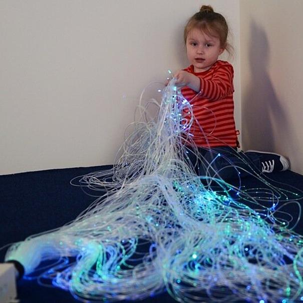 Фиброоптическое волокно предназначено для зрительной стимуляции, релаксации. Волокна можно скручивать и обвивать вокруг себя, волокна не проводят электрический ток и являются совершенно безопасными. Пучок волокон можно разместить на полу, рядом с мягким сиденьем или сухим бассейном. Перебирая руками волокна, наблюдая за плавной сменой цветов, Вы можете расслабиться, настроиться на положительные эмоции. Каждое волокно упаковано в прозрачную защитную оболочку. Все волокна собраны в общий кабель, торец которого должен быть подключен к интерактивному источнику света. Фиброоптическое волокно совершенно безопасно при тактильных контактах, не боится воды и мороза.